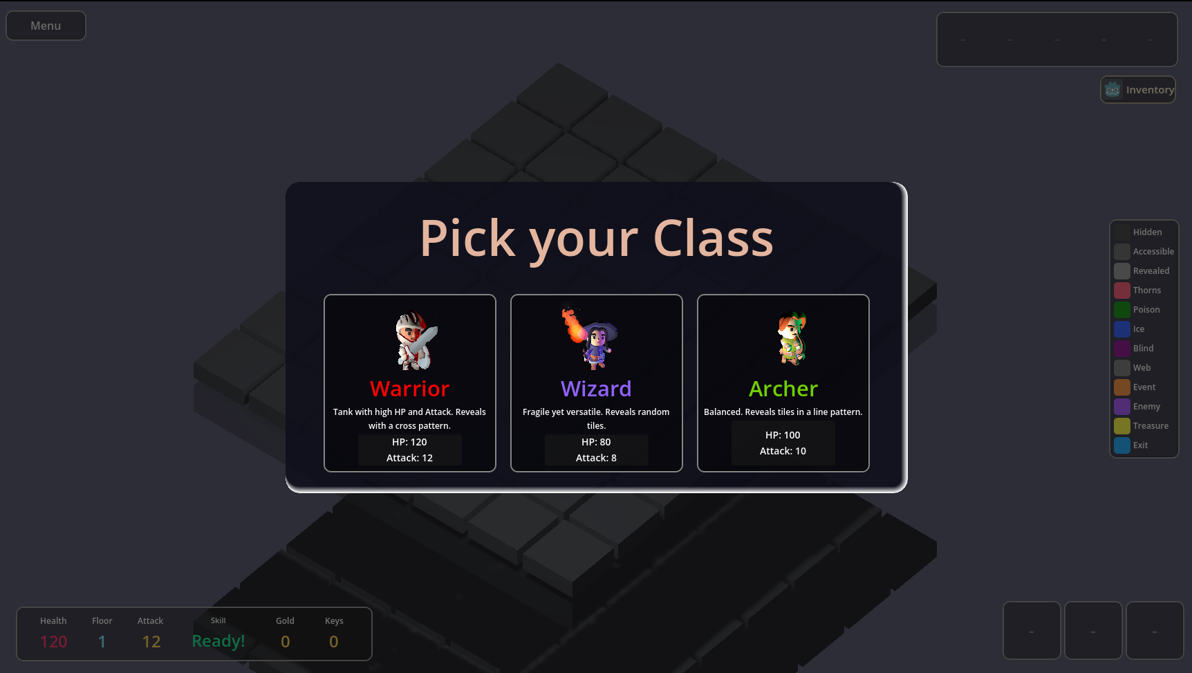 The map is a grid of hidden tiles. You learn what is underneath by stepping onto tiles from adjacent revealed space (or by using your class skill). Numbers on revealed tiles count nearby threats; use them like Minesweeper to plan safer moves. Clearing a big safe pocket can flood-reveal many tiles at once.